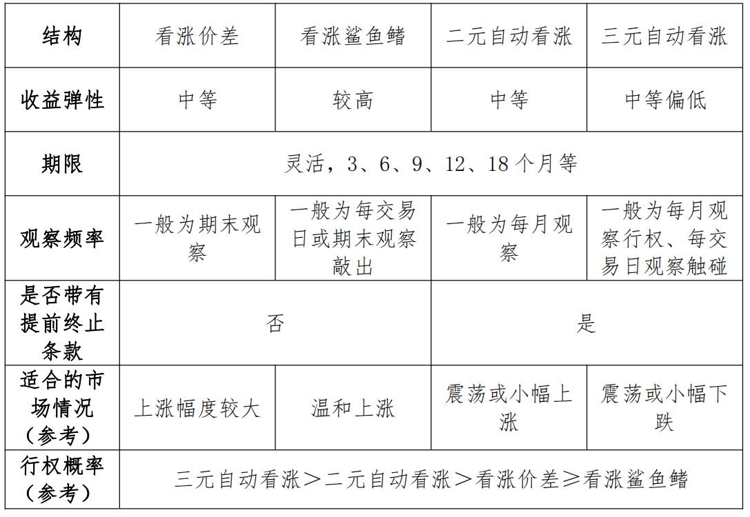 1、低/中低风险(R1-R2)的产品:这类产品通常力争规避挂钩标的下跌风险,适合风险偏好较低(一般为C1-C2)的投资者。较为常见的结构包括鲨鱼鳍结构、价差结构、二元/三元自动行权结构等,以表达看涨观点的结构为例,各结构特点比较如下: