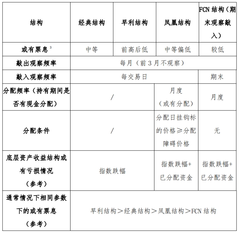 3、中高/高风险(R4-R5)的产品:此类产品通常带有一定幅度的下跌保护,或较高的上涨参与率,具有相对较高的收益弹性,适合中高/高风险偏好的投资者。下文主要比较大雪球、指数增强和加倍看涨结构,其中常见的大雪球结构主要包括经典结构、早利结构、凤凰结构和FCN结构等,各结构特点比较如下: