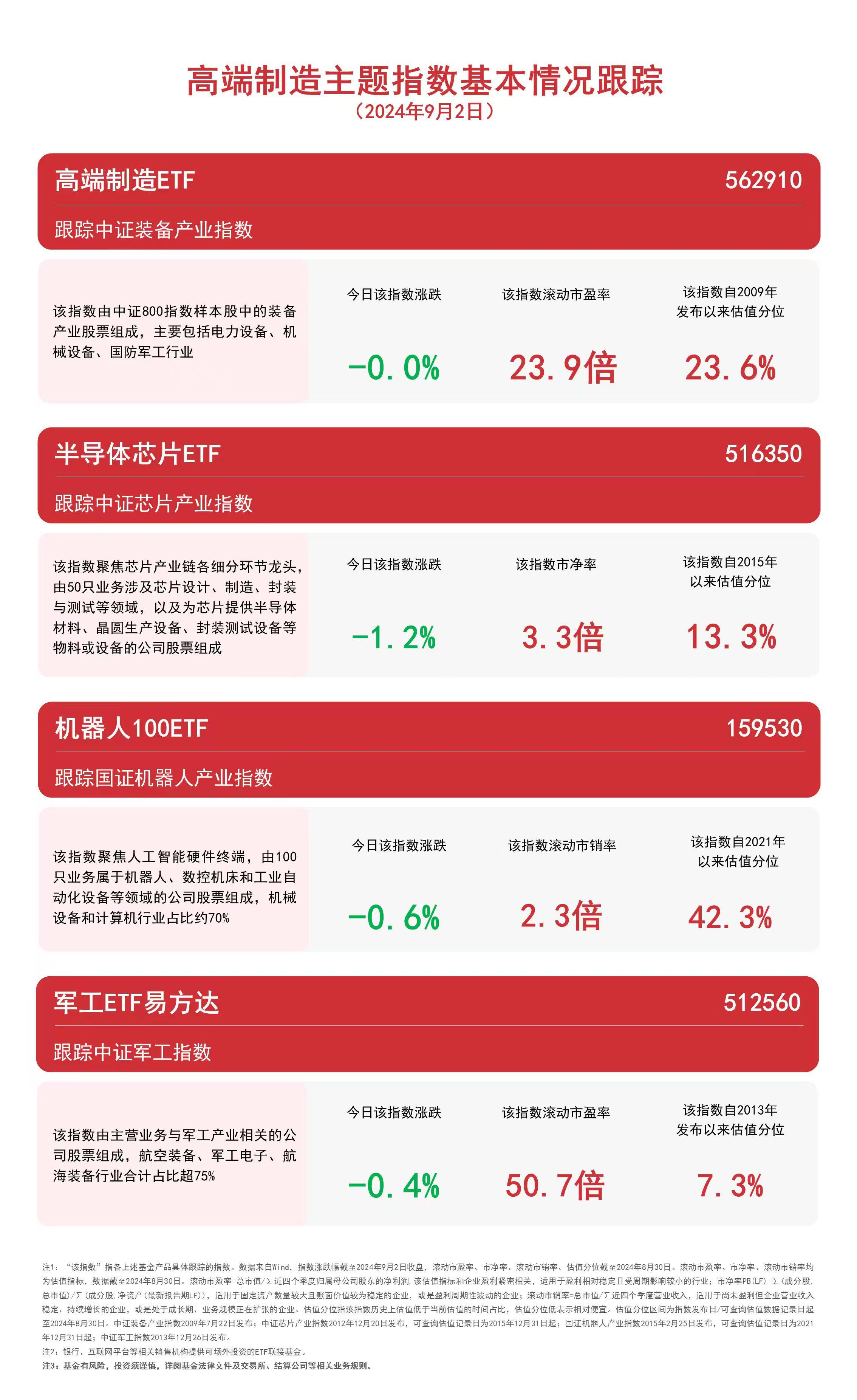 截至收盘,今日中证装备产业指数下跌0.03%,中证芯片产业指数下跌1.2%,国证机器人产业指数下跌0.6%,中证军工指数下跌0.4%。