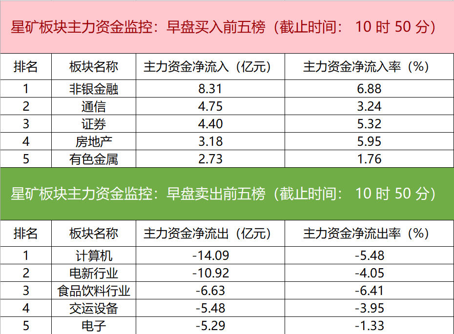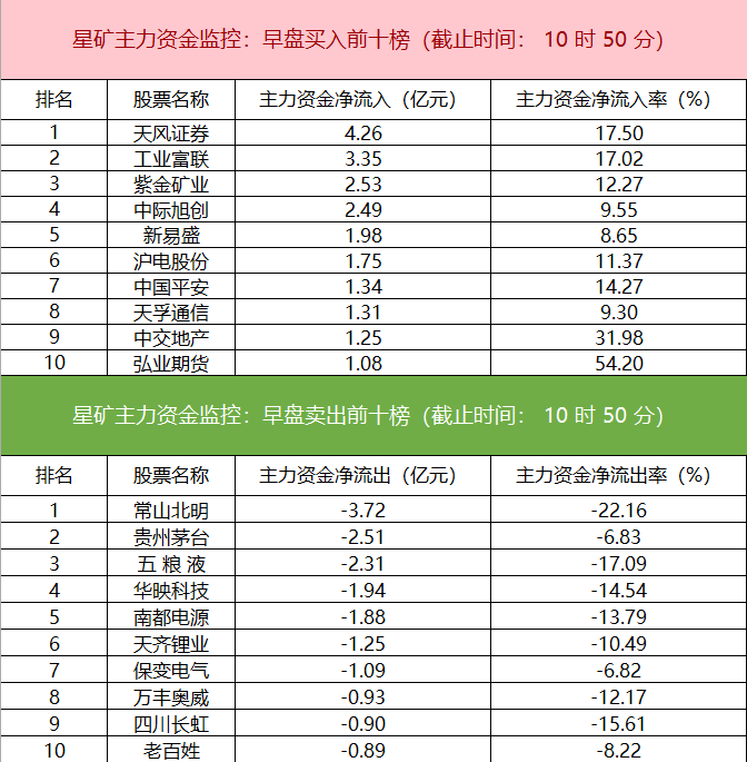 财联社9月13日电,财联社星矿数据显示,今日早盘主力资金净流入非银金融、通信、证券等板块,净流出计算机、电新行业、食品饮料行业等板块,其中计算机板块净流出超14亿元。个股方面,天风证券大涨,主力资金净买入4.26亿元位居首位,工业富联、紫金矿业、中际旭创获主力资金净流入居前;常山北明遭净卖出超3亿元,贵州茅台、五粮液、华映科技主力资金净流出额居前。