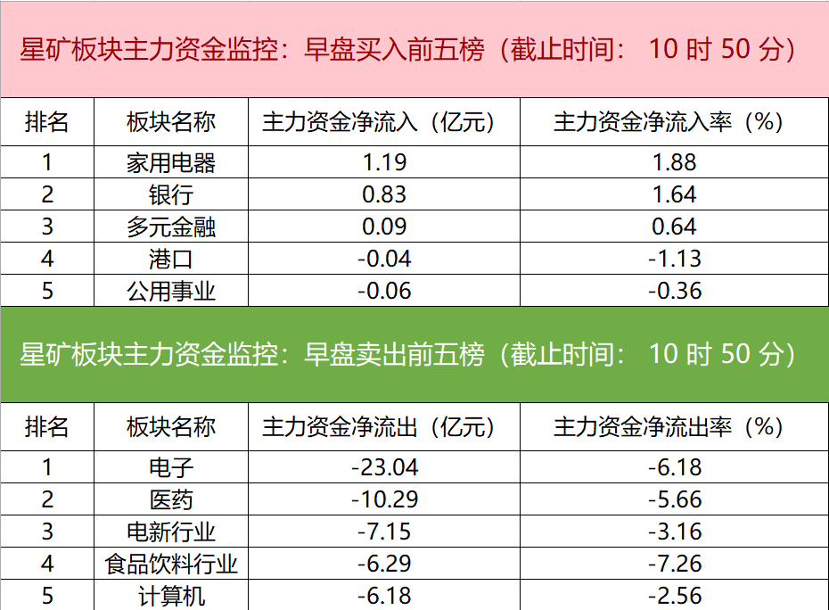 财联社9月18日电,财联社星矿数据显示,今日早盘主力资金净流入家用电器、银行、多元金融等板块,净流出电子、医药、电新行业等板块,其中电子板块净流出超23亿元。个股方面,常山北明涨停,主力资金净买入6.45亿元位居首位,巨轮智能、农业银行、光启技术获主力资金净流入居前;东山精密遭净卖出超2亿元,天茂集团、贵州茅台、保变电气主力资金净流出额居前。