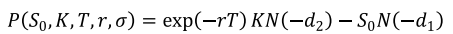其中N是标准正态分布累计分布函数。使用类似的方法,可以得到欧式看跌期权价格为: