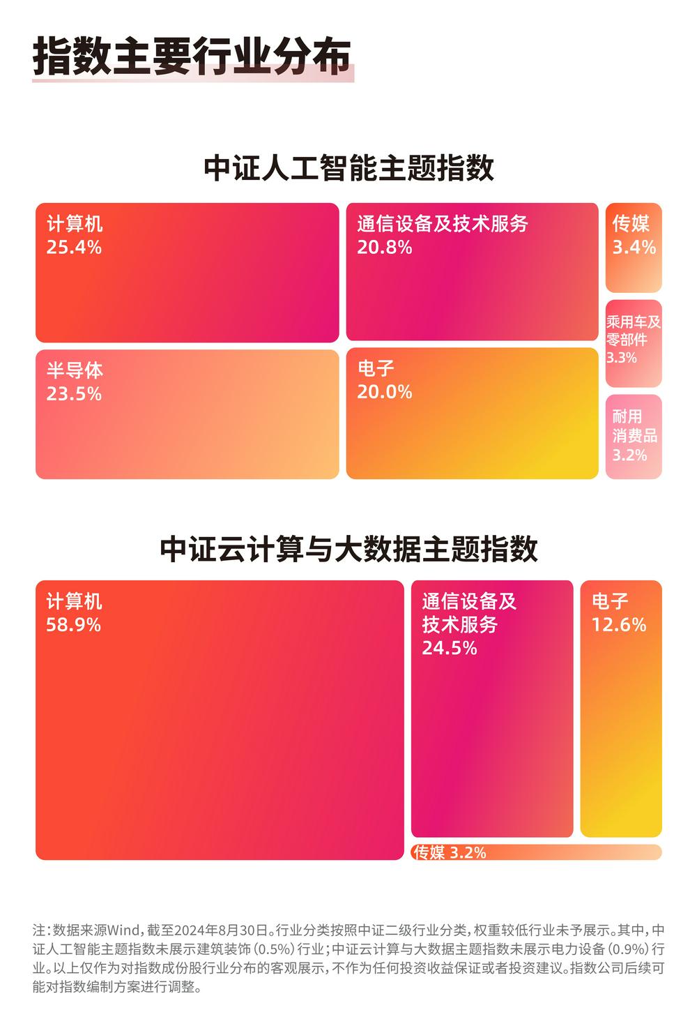 随着AI模型应用不断扩展,全球算力需求高速增长,云计算、人工智能等行业持续受到关注。中证云计算与大数据主题指数聚焦人工智能产业链上游的算力和下游的软件应用,中证人工智能主题指数聚焦产业链的各细分环节龙头。云计算ETF(516510)、人工智能ETF(159819)等产品跟踪上述指数,可助力投资者布局板块发展机遇。