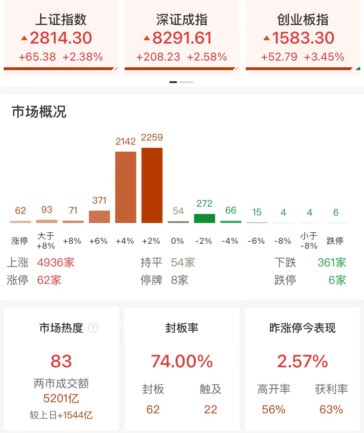 财联社9月24日电,市场早盘放量大涨,三大指数均涨超2%。沪深两市半日成交额5201亿,与上个交易日放量1544亿。盘面上,大金融股全线爆发,太平洋、天风证券、中粮资本、弘业期货等10余股涨停。新能源赛道股震荡走高,德方纳米、龙蟠科技、弘元绿能等涨停。并购重组概念股持续活跃,银之杰、易成新能、双成药业、中电电机等10余股涨停。中字头、国企改革概念股盘中拉升,中成股份、五矿资本、中信海直、上海九百等20余股涨停。钢铁股再度走强,中南股份、凌钢股份、安阳钢铁、西宁特钢涨停。总体上个股涨多跌少,全市场超4900只个股上涨。板块方面,多元金融、钢铁、证券、光伏等板块涨幅居前,无下跌板块。截至收盘,沪指涨2.38%,深成指涨2.58%,创业板指涨3.45%。