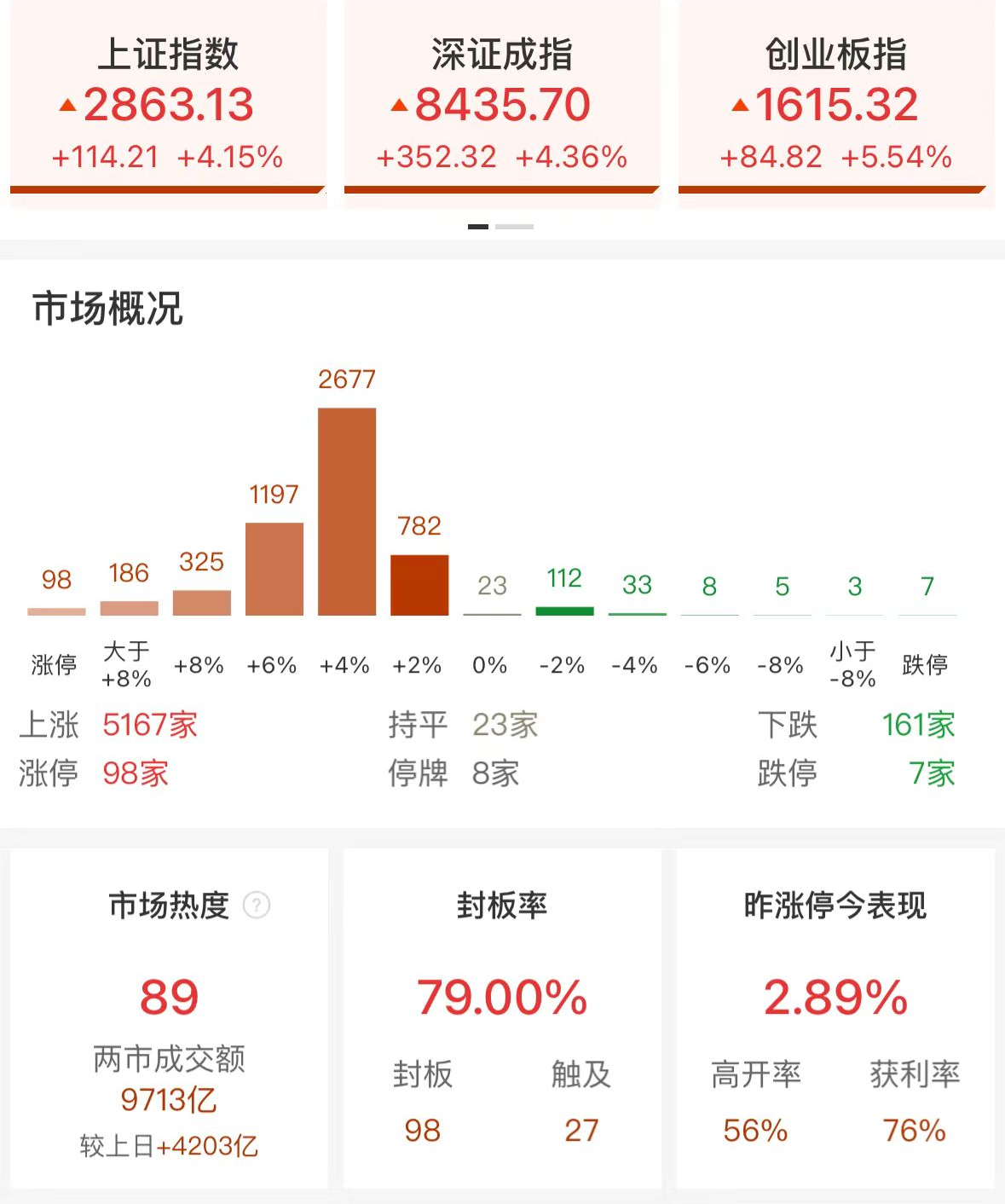 收评:沪指涨4.15%创4年多来最大单日涨幅 两市成交额超9700亿
