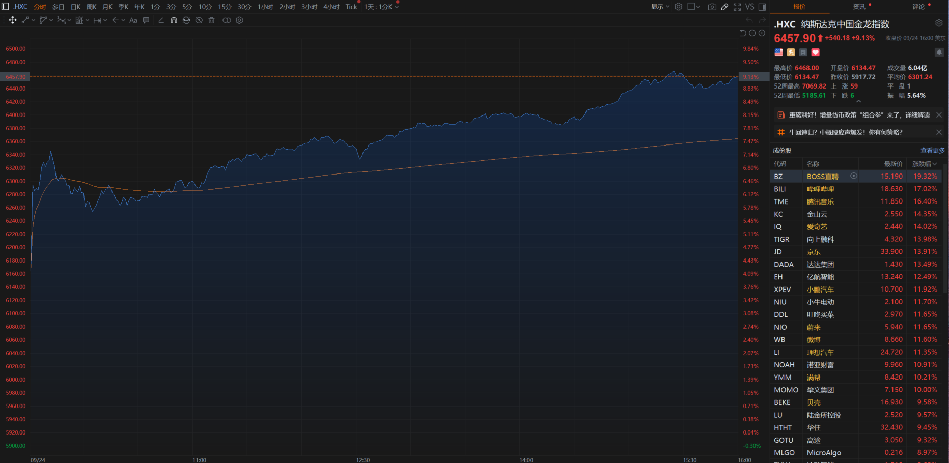 热门中概股普涨 纳斯达克中国金龙指数涨超9%