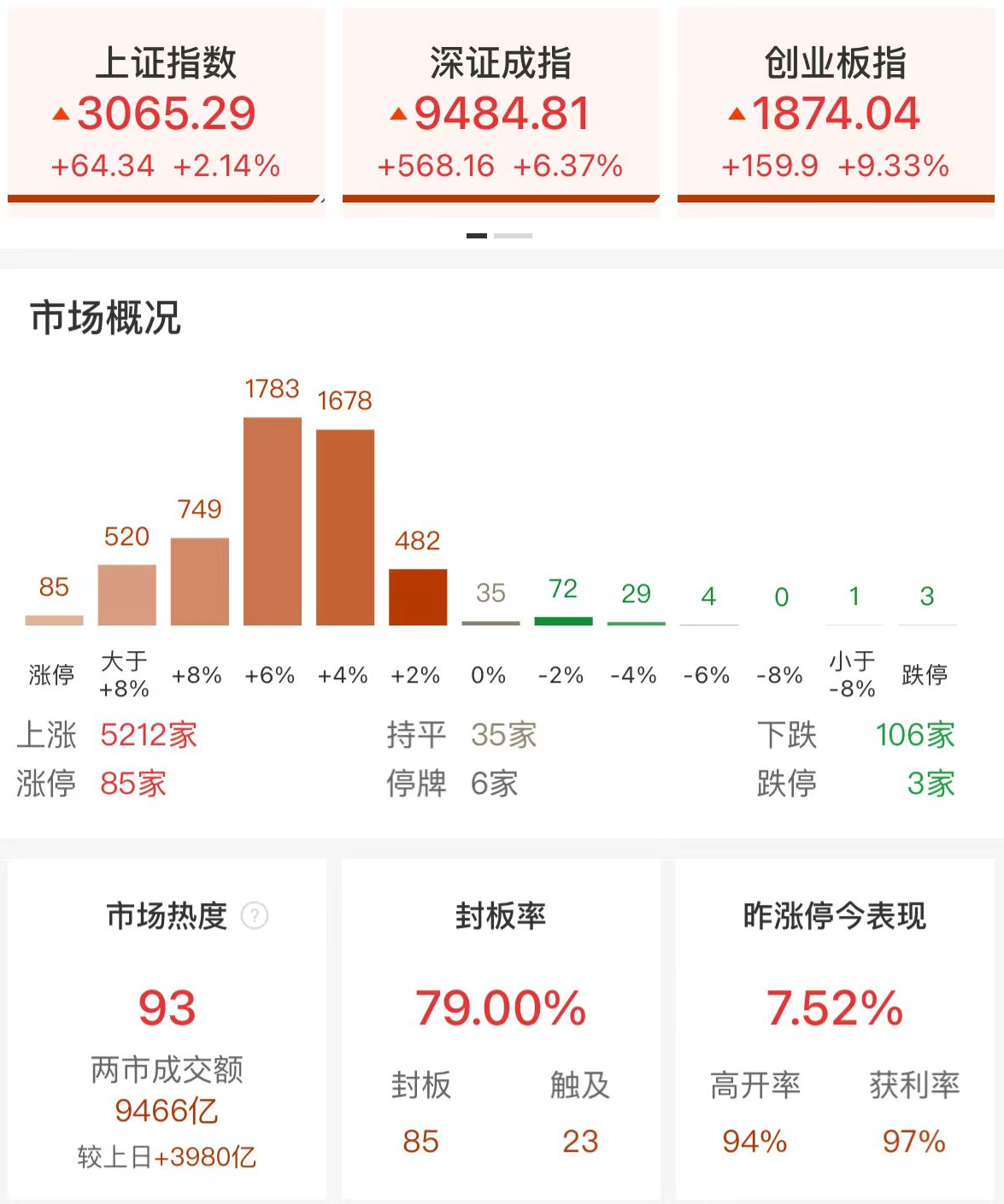财联社9月27日电,市场早盘继续走高,创业板指在宁德时代、东方财富等权重股带动下大涨。盘面上,大金融及金融科技股集体大涨,天风证券、长江证券、银之杰、安硕信息等多股涨停。锂电池、光伏等赛道股展开反弹,领湃科技、金杨股份、金刚光伏、福莱特等涨停。白酒股持续走强,舍得酒业、古井贡酒、酒鬼酒等涨停。地产股震荡走高,金地集团、阳光股份、万科A、金融街等涨停。下跌方面,银行股冲高回落,农业银行跌超3%。总体上个股涨多跌少,全市场超5200只个股上涨。沪深两市半日成交额9466亿。板块方面,白酒、光伏、电池、软件开发等板块涨幅居前,银行等少数板块下跌。截至收盘,沪指涨2.14%,深成指涨6.37%,创业板指涨9.33%。