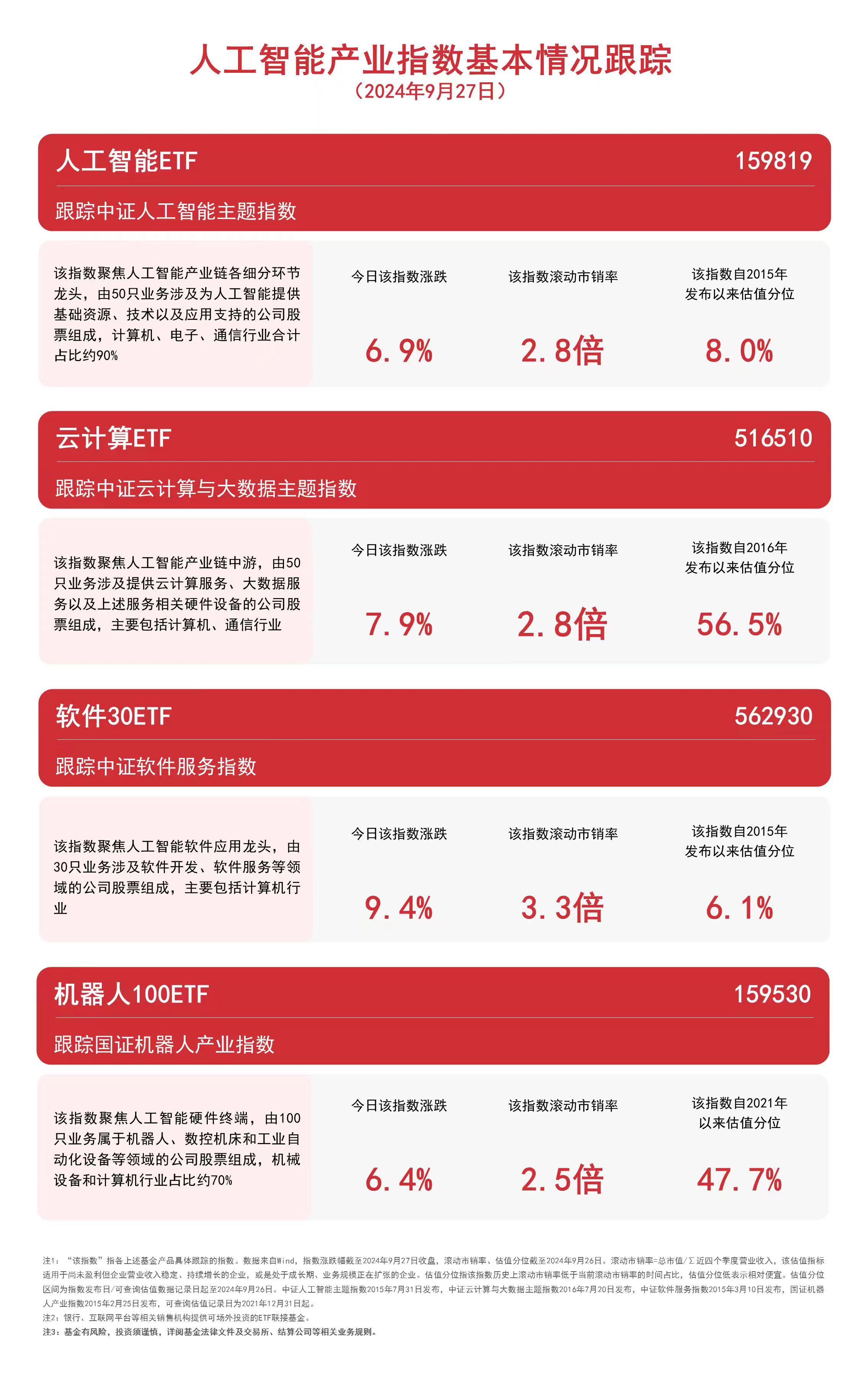财联社9月27日电,截至收盘,今日中证软件服务指数上涨9.4%,中证云计算与大数据主题指数上涨7.9%,中证人工智能主题指数上涨6.9%,国证机器人产业指数上涨6.4%。