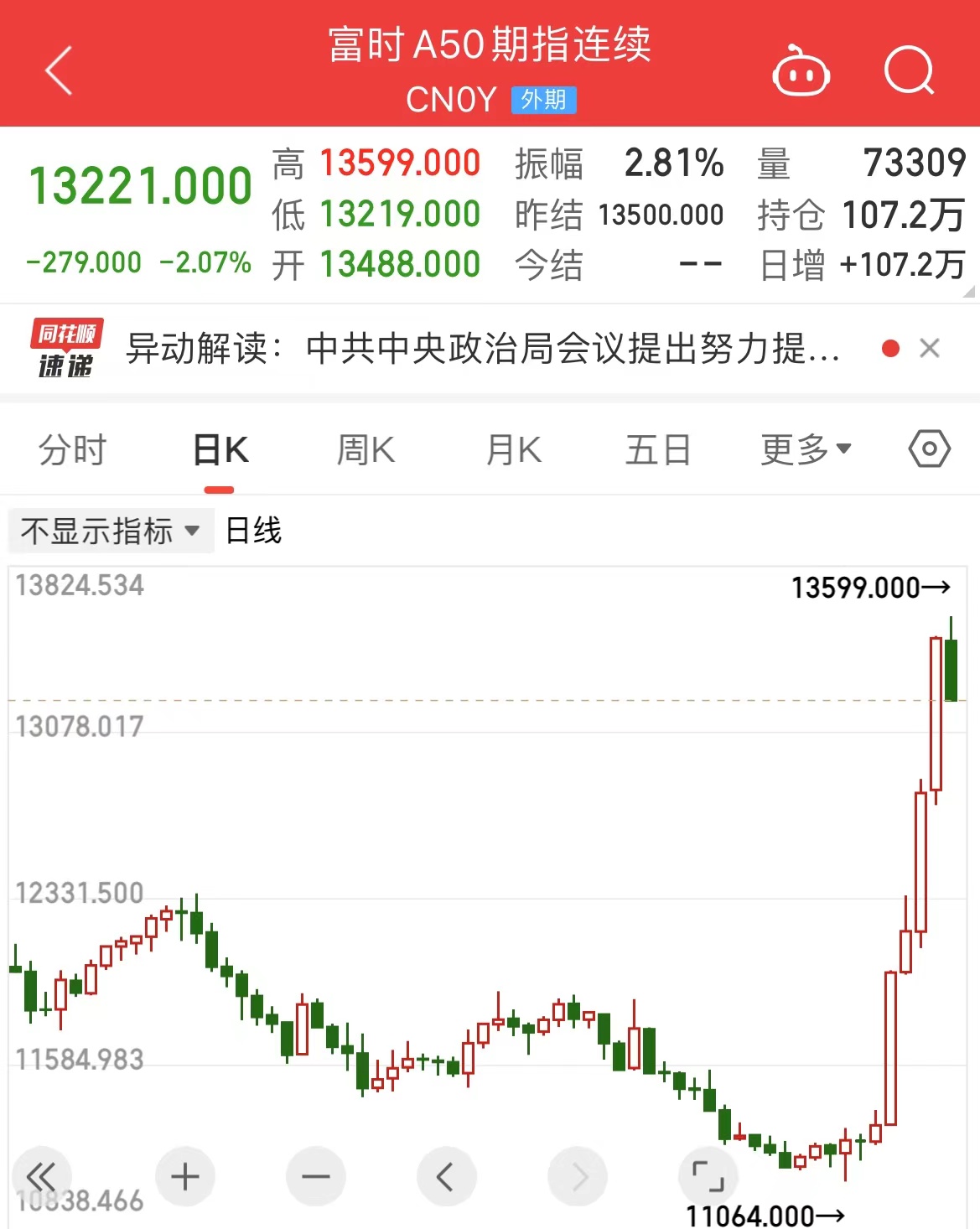财联社9月27日电,富时中国A50指数期货跌幅扩大至2%,过去的5个交易日该指数已累涨近20%。