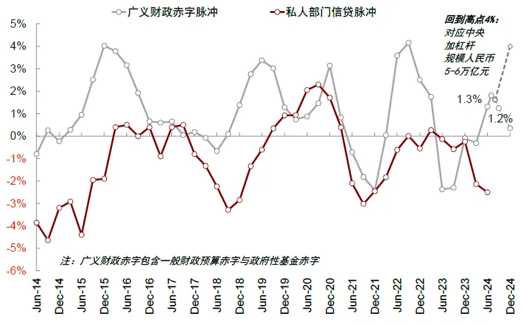 图表:若明年年中广义财政赤字脉冲回到历轮高点(4%),对应广义赤字规模扩张5-6万亿元