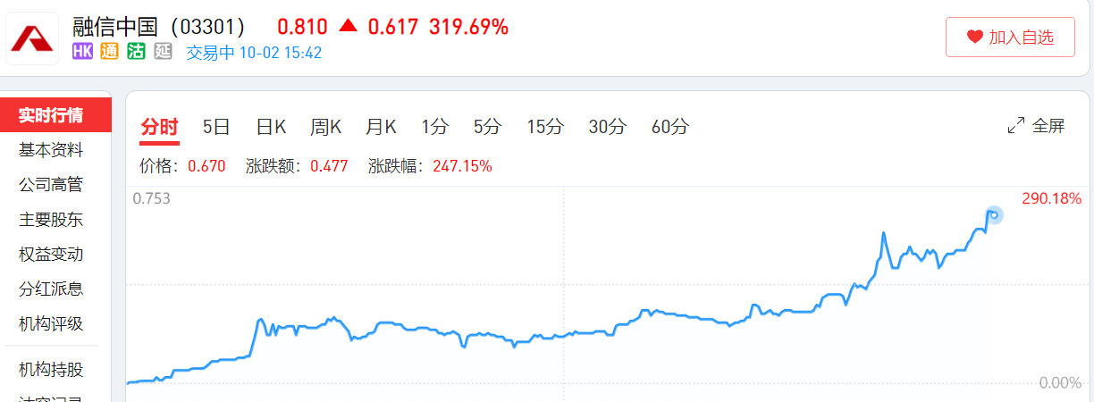 财联社10月2日电,内地房地产股融信中国(03301.HK)尾盘涨幅扩大,截至发稿涨319%,成交超2500万港元,报0.81港元。