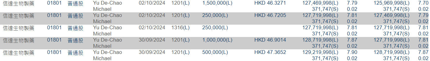财联社10月4日电,据香港联交所披露易今日公布的数据,信达生物(01801.HK)被创始人、执行董事、董事会主席兼首席执行官俞德超在9月30日和10月2日合计减持325万股,总金额约1.52亿港元。减持后,俞德超所持股份占比由7.90%降至7.70%,持股数降为约1.2597亿股。
