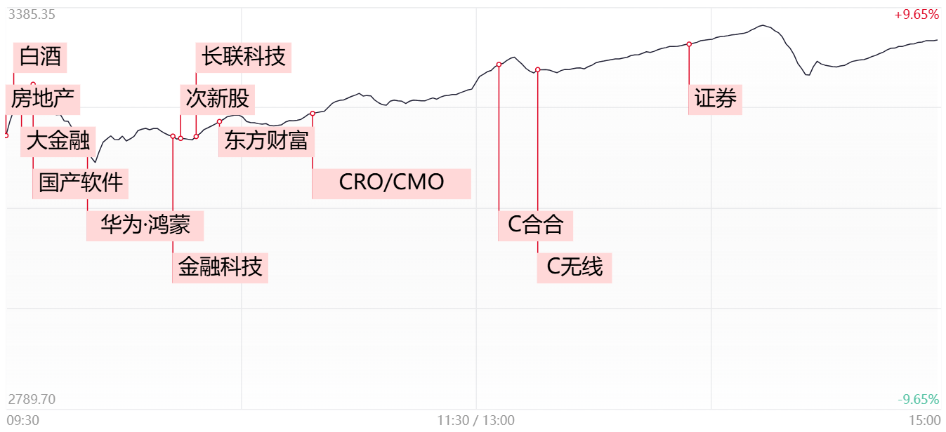 上个交易日,市场延续放量普涨,创业板指再度上涨15%刷新单日涨幅记录,9月单月上涨近38%,创单月涨幅历史纪录。沪深两市成交额超2.59万亿元,创出历史记录。两市超700股涨停,超2700股涨超10%。1)中央金融办、证监会联合印发《关于推动中长期资金入市的指导意见》,建设培育鼓励长期投资的资本市场生态。大金融板块持续站上风口,中信证券、东方财富、天风证券、国海证券等四十余只券商股悉数涨停,其中东方财富成交306亿元续创历史天量。此外中国平安、新华保险、中国人寿三只保险股也悉数涨停。而金融科技作为整个大金融的情绪风向标同样涨势火爆,恒银科技继续缩量一字晋级6连板,指南针、同花顺、财富趋势等纷纷上板。2)华为在秋季全场景新品发布会上宣布,HarmonyOS NEXT将在10月8日开启公测。消息面利好频传,刺激鸿蒙概念再度爆发,常山北明走出13天7板,润和软件开盘超预期走出高开上板,带动另两只鸿蒙传统龙头软通动力、诚迈科技也双双涨停。3)进入到四季度的“十一”假期和“双11”的叠加效应助推消费增长预期。大消费板块修复力度有增无减,五粮液、泸州老窖、山西汾酒、安井食品、绝味食品等继续实现连板晋级。4)并购重组概念热度仍然高涨,双成药业继续一字涨停晋级12连板,而宣布资产收购事项的科创芯片股思林杰走出4天3板,进而带动整个半导体产业链持续表现回暖,国民技术、思瑞浦、龙芯中科等二十余股涨停。
