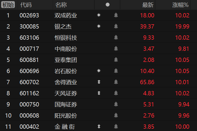财联社10月8日电,市场焦点股双成药业(12板)竞价涨停,金融科技板块银之杰(创业板8天7板)竞价涨停、恒银科技(6板)竞价涨停,国企改革概念股中南股份(10天7板)高开9.81%、亚泰集团(6板)竞价涨停,白酒股岩石股份(8天6板)竞价涨停、舍得酒业(3板)竞价涨停,大金融板块天风证券(5板)竞价涨停、国海证券(5板)竞价涨停,地产股阳光股份(5板)竞价涨停、金融街(4板)竞价涨停。