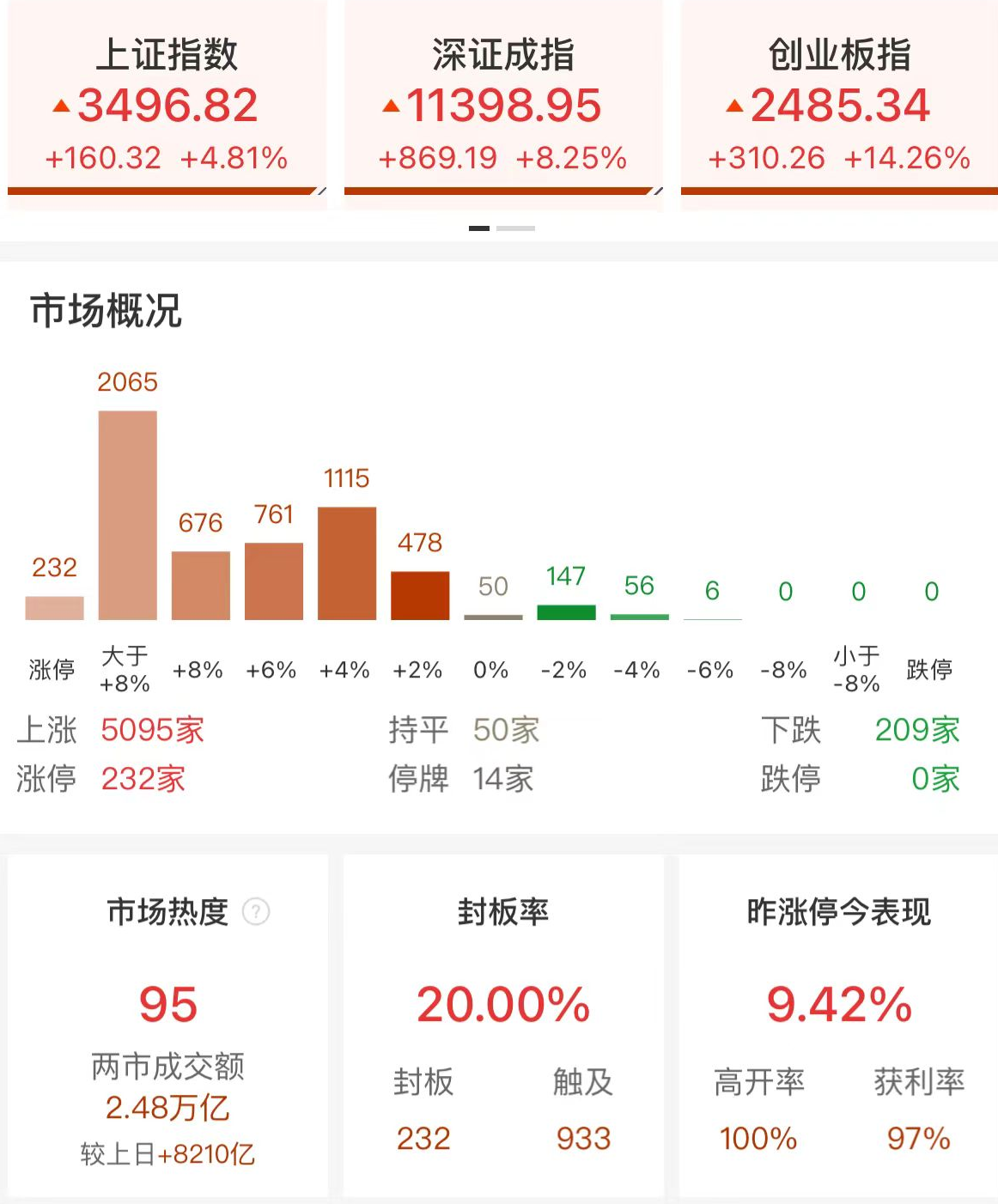 财联社10月8日电,市场早盘大幅高开回落后再度走高,创业板指涨超14%。沪深两市半日成交额2.48万亿,较上个交易日放量8210亿。盘面上,大金融股维持强势,券商股领涨,东方财富、天风证券、中信证券、中信建投等40股涨停;金融科技股继续走强,财富趋势、同花顺、指南针、汇金科技等多股涨停。半导体板块开盘大涨,中芯国际、寒武纪、台基股份、卓胜微等60余股涨停。鸿蒙概念股震荡走高,法本信息、天源迪科、诚迈科技、软通动力等30余股涨停。总体上个股涨多跌少,全市场超5000只个股上涨。板块方面,半导体、软件开发、财税数字化、鸿蒙概念等板块涨幅居前,旅游等少数板块下跌。截至收盘,沪指涨4.81%,深成指涨8.25%,创业板指涨14.26%。