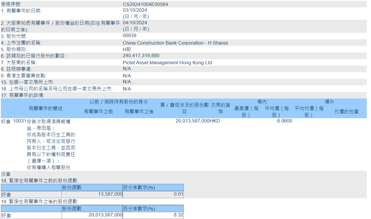 财联社10月8日电,据港交所披露易今日修正的数据,瑞士百达资产管理10月3日增持建设银行H股(00939.HK)2000万股,而非昨日公布的数据中增加的200亿股。