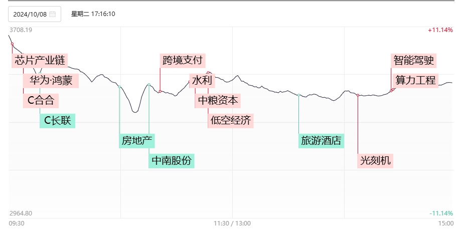 财联社10月9日电,市场大幅高开回落后再度走高,创业板指续创历史单日最大涨幅。沪深两市全天成交额3.45万亿元,较节前放量8589亿,续创历史天量。整体上个股涨多跌少,全市场超5000只个股上涨。1)国庆假期之际,投资者开户热情高涨,有券商日均开户申请量较往日提高4倍,客户咨询量倍增。A股券商股全线实现连板晋级,其中东方财富走出20CM3连板并再创超330亿元的成交天量。金融科技方向表现更为坚挺,银之杰和恒银科技两只人气龙头仍维持缩量一字涨停。2)鸿蒙概念持续站上风口,人气龙常山北明全天缩量一字涨停,润和软件、诚迈科技、软通动力三只行业龙头实现连板晋级。3)国庆长假4个交易日,港股半导体板块迎来大涨,中芯国际累涨近60%,芯片股迎来爆发,并购半导体资产的双成药业走出13连板,中芯国际等200多家个股涨停。4)北京市经济和信息化局等四部门印发《北京市促进低空经济产业高质量发展行动方案(2024—2027年)》,除北上广深,以及成都、苏州等新一线城市持续布局,目前二三线城市正加速入局eVTOL。低空经济概念盘中表现不俗,深城交、莱斯信息、安达维尔、新城市等多股涨停。
