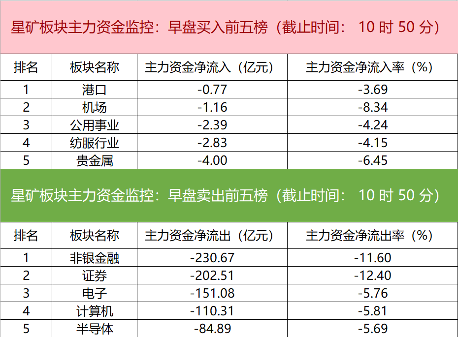 财联社10月9日电,财联社星矿数据显示,今日早盘无主力资金净流入的板块,净流出非银金融、证券、电子等板块,其中非银金融板块净流出超230亿元。个股方面,天风证券涨停,主力资金净买入2.54亿元位居首位,中微公司、国民技术、大众交通获主力资金净流入居前;东方财富遭净卖出超53亿元,中信证券、同花顺、太平洋主力资金净流出额居前。