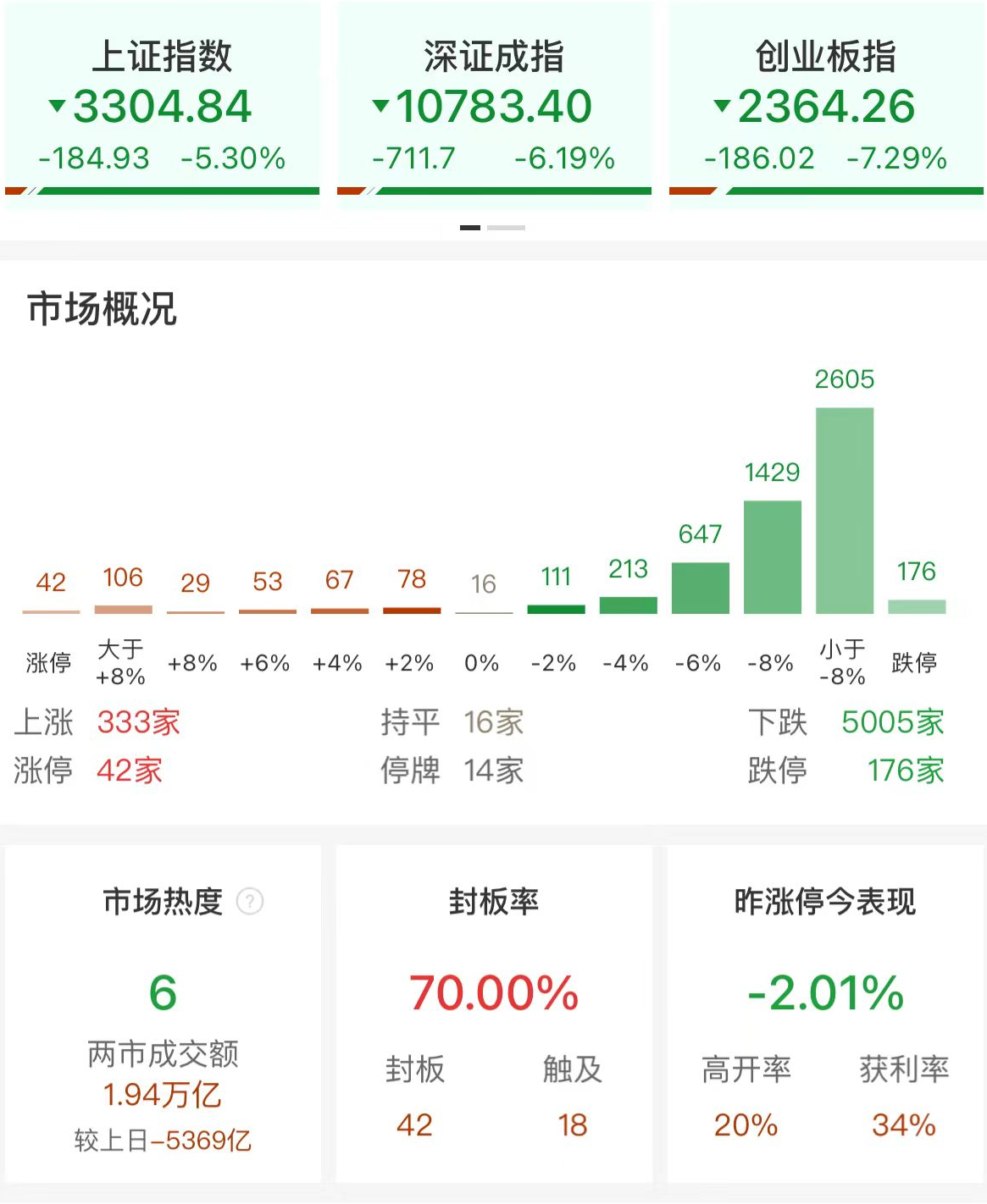 财联社10月9日电,市场早盘集体大跌,创业板指领跌。盘面上,芯片股一度冲高,捷捷微电、珂玛科技、国民技术、龙图光罩等涨停。券商股冲高回落,东方财富、中信证券盘中均创出历史新高。鸿蒙概念股局部活跃,润和软件、常山北明、深水海纳、安硕信息等涨停。下跌方面,大消费股全线调整,唐德影视等多股跌超10%;新能源赛道股震荡走低,宁德时代等多股跌超10%。总体上个股跌多涨少,全市场超5000只个股下跌,逾百股跌停。沪深两市半日成交额1.94万亿,较上个交易日缩量5369亿。板块方面,华为欧拉等少数板块上涨,游戏、影视、乳业、光伏等板块跌幅居前。截至收盘,沪指跌5.3%,深成指跌6.19%,创业板指跌7.29%。