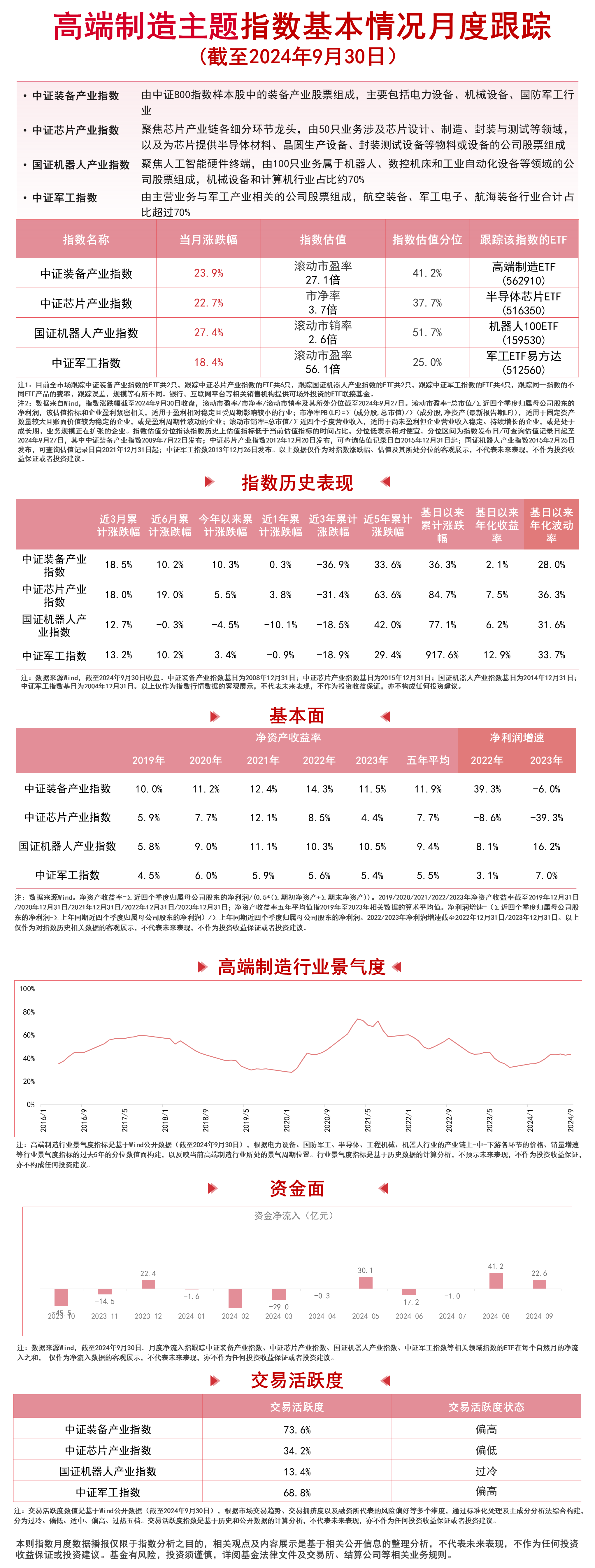 9月,中证装备产业指数上涨23.9%,中证芯片产业指数上涨22.7% ,国证机器人产业指数上涨27.4% ,中证军工指数上涨18.4%。