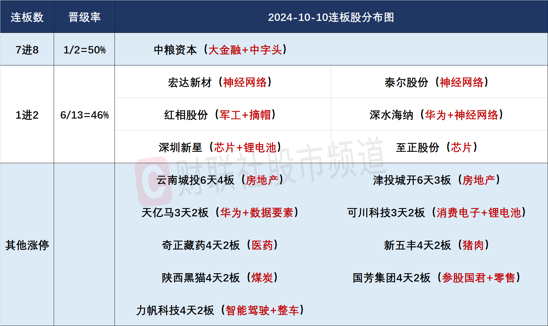 今日共71股涨停,连板股总数7只,其中三连板及以上个股1只,上一交易日共31只连板股,连板股晋级率3.22%(不含ST股、退市股)。个股方面,高位股猛烈退潮,双成药业、银之杰、国海证券 、英方软件等一批高位连板股跌停,此外新力金融、弘业期货、阳光股份、亚泰集团等10股已经二连跌停。日内亏钱效应剧烈,恒银科技、天风证券上演“天地板”,海立股份午后炸板最终收跌近9%,仅中粮资本“天地天板”晋级8连板,成为两市唯一晋级的连板股。板块方面,央行创设首期规模5000亿元互换便利今日出台,高股息板块迎来实质性利好,中国神华大涨超6%,工农中建四大行均涨超3%,长江电力涨超2%;中字头个股盘中崛起,超20余股涨停或涨超10%,其中中铁装配、中粮科工、中建环能等7股20CM涨停。