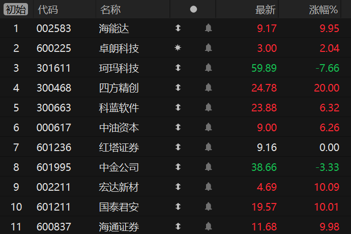 财联社10月14日电,市场焦点股海能达(12天10板)竞价涨停,地产+算力的卓朗科技(12天8板)高开2.04%,锂电+芯片的珂玛科技(创业板5天4板)低开7.66%,跨境支付概念股四方精创(创业板5天3板)竞价涨停、科蓝软件(创业板5天3板)高开6.32%、中油资本(8天4板)高开6.26%,大金融板块红塔证券(5天3板)平开、中金公司(5天3板)低开3.33%,有机硅+神经网络的宏达新材(3板)竞价涨停,并购重组的国泰君安(2板)竞价涨停、海通证券(2板)竞价涨停。