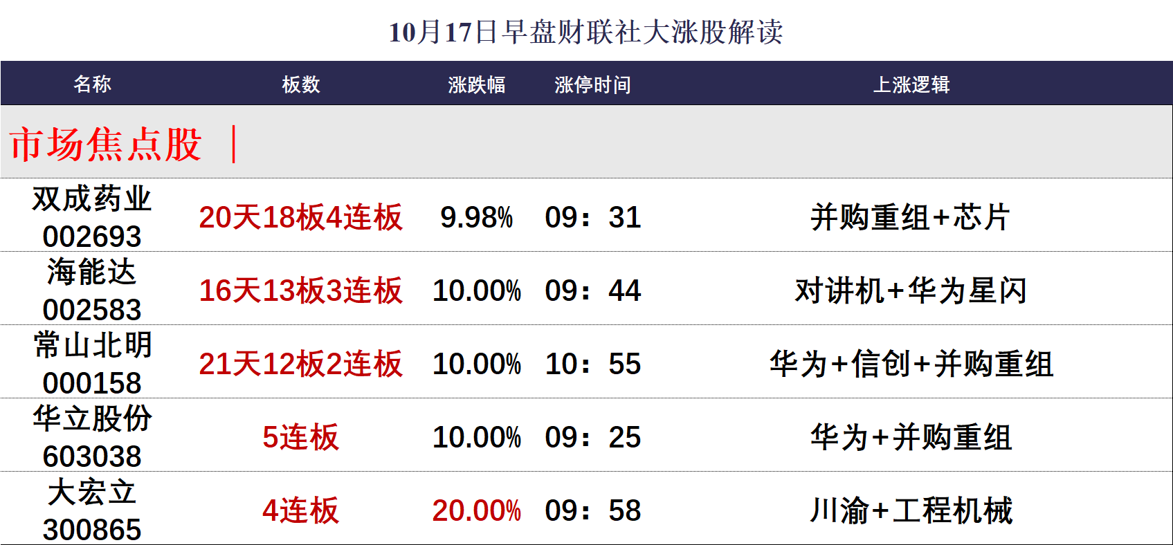 财联社10月17日电,今日午盘全市场共55股涨停,连板股总数19只,18股封板未遂,封板率为75%(不含ST股、退市股)。焦点股方面,高位股强者恒强,双成药业20天18板4连板,海能达16天13板3连板,常山北明21天12板2连板;北交所个股集体大涨,其中天马新材、优机股份30CM2连板。