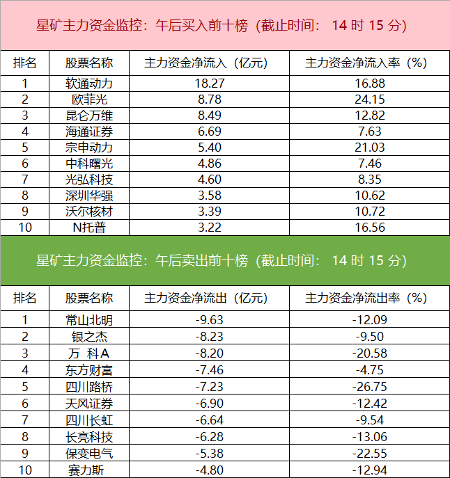 财联社10月17日电,财联社星矿数据显示,今日主力资金净流入电子、计算机、文化传媒等板块,净流出房地产、建筑工程、电新行业等板块,其中房地产板块净流出46.07亿元。个股方面,软通动力一度涨停,主力资金净流入18.27亿元居首位,欧菲光、昆仑万维、海通证券获主力资金净流入居前;常山北明遭净卖出9.63亿元居净流出首位,银之杰、万科A、东方财富等主力资金净流出额居前。