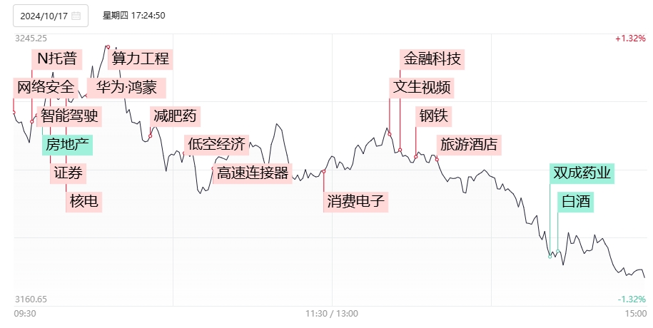 财联社10月18日电,市场全天冲高回落,沪指收盘失守3200点,北证50指数盘中一度大涨超11%。整体上个股跌多涨少,全市场超3400只个股下跌。沪深两市全天成交额1.49万亿元,较前日放量1159亿。1)中国网络空间安全协会16日发文批评英特尔产品安全漏洞问题频发,网络安全、信创概念集体爆发,进而带动鸿蒙等方向盘中再度冲高,中国长城、国华网安、任子行、南威软件等涨停,软通动力、常山北明一度封板。2)华为Mate 70系列智能手机已在9月底进入全面量产阶段,并预计将于今年11月正式面市。消费电子板块盘中仍表现不俗,欧菲光、福莱新材、捷邦科技涨停,思泉新材、思特威、领益智造等涨幅靠前。3)9月26日起停牌的半导体公司富乐德宣布关联收购功率半导体公司富乐华100%股权,该股全天无量封死一字涨停,收盘时封单金额仍高达近20亿元,而光智科技复牌后连续第四日封死一字涨停,此外连板最高标华立股份继续一字涨停晋级5连板以及尾盘人气龙头双成药业走出天地天涨停,继续强化并购重组概念的人气地位。4)央行、金融监管总局和住建部在国新办发布会上提出房地产相关一系列政策举措,包括将通过货币化安置房方式新增实施100万套城中村改造、危旧房改造、年底前将“白名单”项目信贷规模增加到4万亿元等。房地产板块遭到资金兑现,金地集团、新城控股双双跌停,保利发展、万科等多股跌超7%。