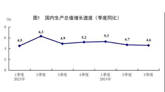 财联社10月18日电,国家统计局10月18日发布数据显示,初步核算,前三季度国内生产总值949746亿元,按不变价格计算,同比增长4.8%。分产业看,第一产业增加值57733亿元,同比增长3.4%;第二产业增加值361362亿元,增长5.4%;第三产业增加值530651亿元,增长4.7%。分季度看,一季度国内生产总值同比增长5.3%,二季度增长4.7%,三季度增长4.6%。从环比看,三季度国内生产总值增长0.9%。