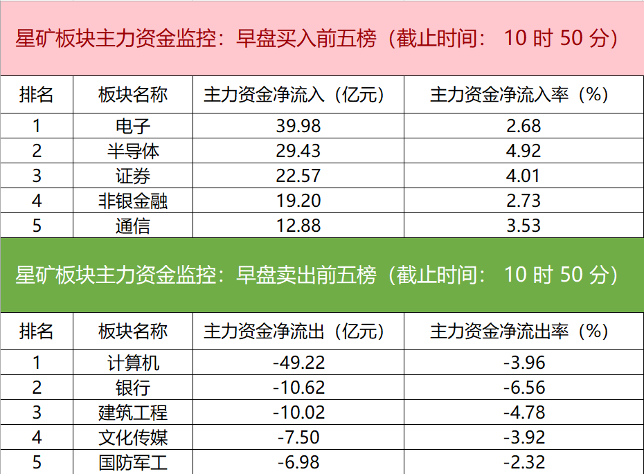 财联社10月18日电,财联社星矿数据显示,今日早盘主力资金净流入电子、半导体、证券板块,净流出计算机、银行、建筑工程等板块,其中计算机板块净流出超49亿元。个股方面,上海贝岭涨停,主力资金净买入10.27亿元位居首位,天风证券、工业富联、东方财富获主力资金净流入居前;软通动力遭净卖出超7亿元,润和软件、昆仑万维、光弘科技主力资金净流出额居前。