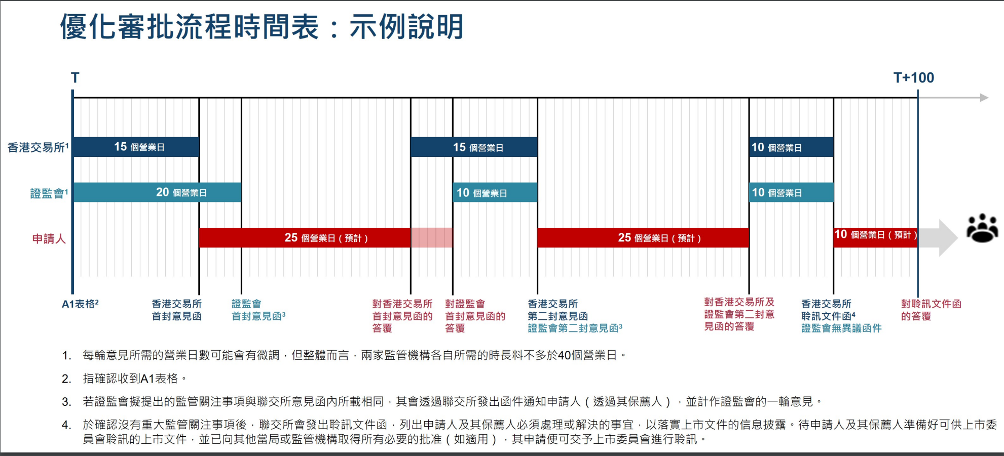 香港证监会称,优化新上市申请审批流程时间表,以进一步提升香港作为区内领先的国际新股集资市场的吸引力。申请人及其保荐人预期可于总共约60个营业日内就监管机构提出的意见给予完满答覆。待取得上市委员会及其他相关部门或监管机构批准后,申请程序预计可于六个月的申请有效期内完成。在合资格A股公司快速审批时间表下,若合资格A股上市公司提交完全符合规定的申请,证监会及联交所分别只会发出一轮监管意见。在此情况下,两家监管机构各自的监管评估将在不多于30个营业日内完成(而非上述适用于「完全符合规定的申请」的不多于40个营业日)。