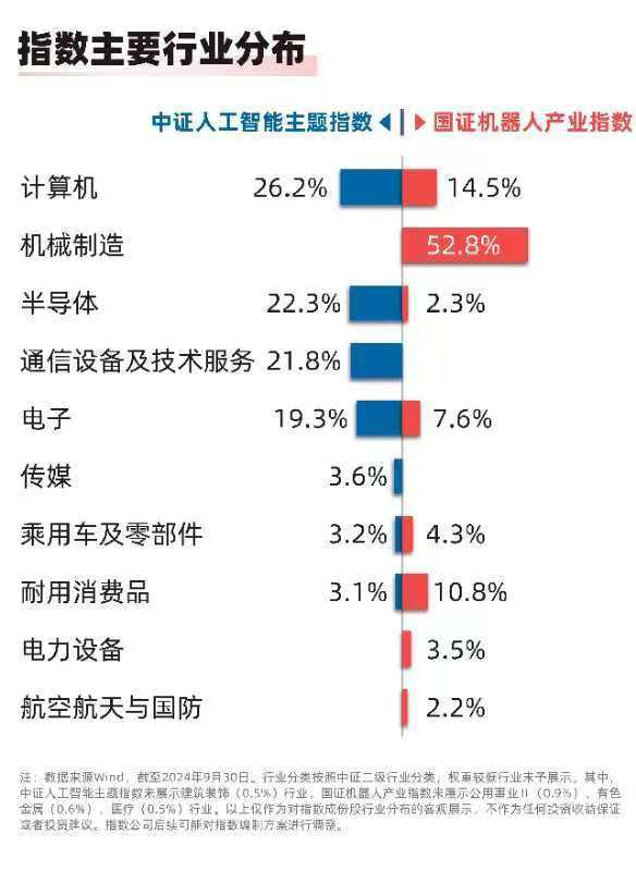 人形机器人产业加速发展,相关产业指数受到市场关注。其中,中证人工智能主题指数聚焦人工智能产业链各细分环节龙头;国证机器人产业指数聚焦人工智能硬件终端,机械制造行业占比过半。人工智能ETF(159819)、机器人100ETF(159530)等产品,可助力投资者布局板块龙头。