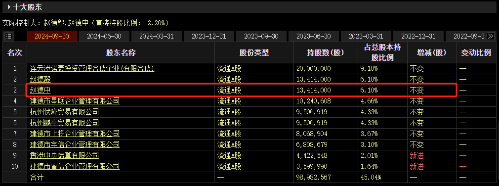 小财注: 资料显示,赵德中曾在诸暨工业设备安装公司就职;2004年9月,投资了杭州诺泰制药技术有限公司(已转让,现更名为杭州阿诺生物医药科技有限公司),开始涉足多肽药物领域;公司整体变更为股份公司后至2022年5月,担任公司副董事长;2009年4月至今,担任公司董事。截至第三季度末,赵德中与其兄赵德毅分别持有诺泰生物6.1%股份,同为公司实控人、第二大股东。