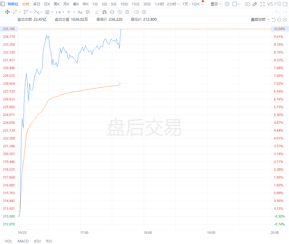 财联社10月24日电,特斯拉股价盘后大涨超10%,财报显示特斯拉第三季度盈利超预期,马斯克预测明年特斯拉汽车销量增长20%-30%。