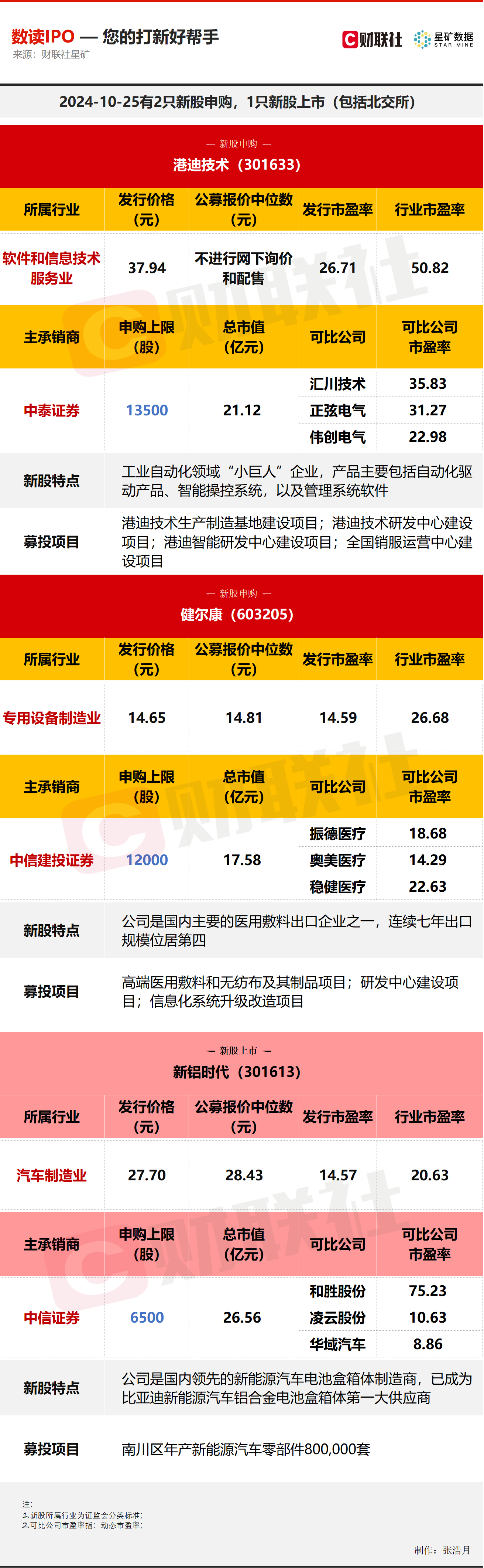 财联社10月25日电,今日有2只新股申购,分别为创业板的港迪技术,沪市主板的健尔康;1只新股上市,为创业板的新铝时代。