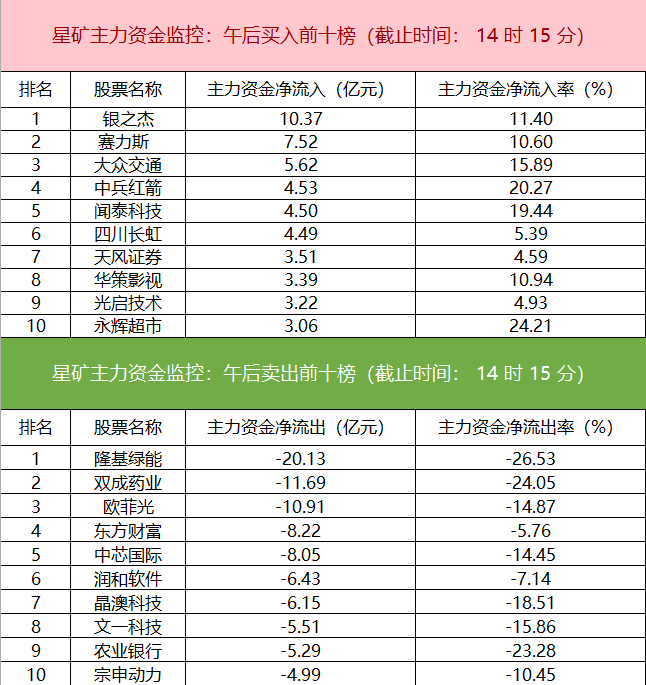 财联社10月28日电,财联社星矿数据显示,今日主力资金净流入商贸零售、家用电器、汽车整车等板块,净流出电子、电新行业、半导体等板块,其中电子板块净流出92.65亿元。个股方面,银之杰大涨,主力资金净流入10.37亿元居首位,赛力斯、大众交通、中兵红箭获主力资金净流入居前;隆基绿能遭净卖出20.13亿元居净流出首位,双成药业、欧菲光、东方财富等主力资金净流出额居前。