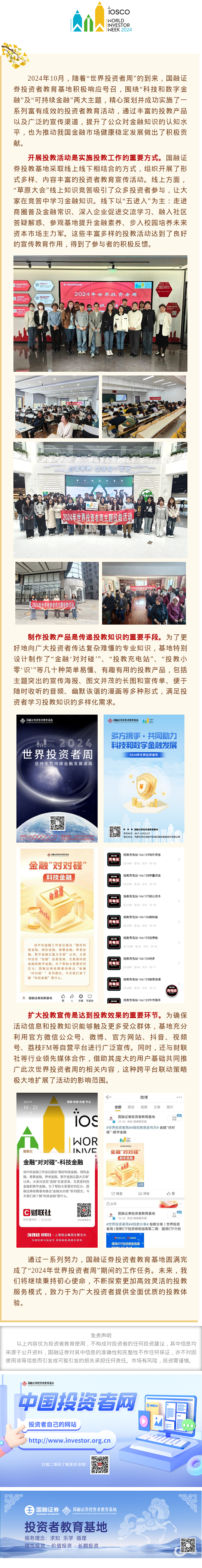 2024年10月,随着“世界投资者周”的到来,国融证券投资者教育基地积极响应号召,围绕“科技和数字金融”及“可持续金融”两大主题,精心策划并成功实施了一系列富有成效的投资者教育活动,通过丰富的投教产品以及广泛的宣传渠道,提升了公众对金融知识的认知水平。