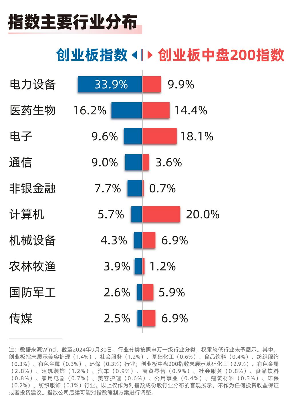 自开市以来,创业板指数体系也在持续完善,投资标的不断丰富。其中,创业板指由创业板中市值大、流动性好的100只股票组成,前三大权重行业分别为电力设备、医药生物、电子,合计占比近60%;创业板中盘200指数由创业板中市值中等、流动性较好的200只股票组成,前三大权重行业为计算机、电子、医药生物,合计占比过半。