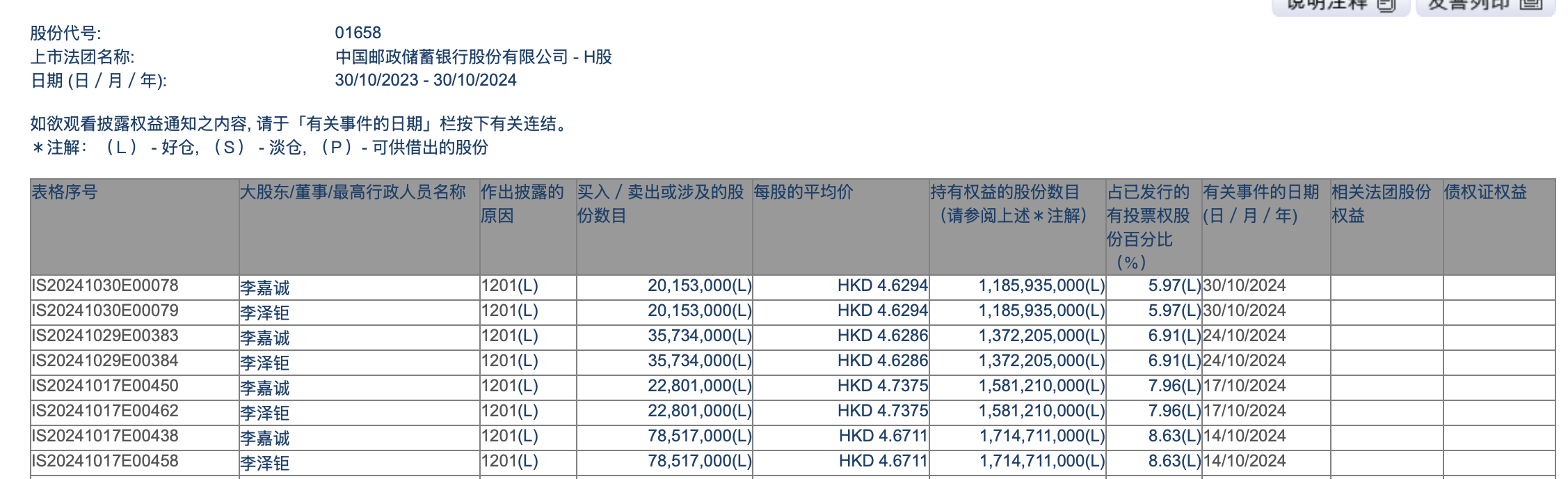 财联社10月30日电,根据香港联交所最新权益披露显示,邮储银行H股10月30日再遭李嘉诚、李泽钜父子以每股均价4.6294港元减持约2015.3万股股份,涉及资金约9329.63万港元。本次减持后,李嘉诚及李泽钜持有邮储银行H股约11.86亿股,持股比例降至5.97%。财联社记者注意到,此前李嘉诚及李泽钜于10月14日、10月17日、10月24日分别减持邮储银行H股7851.7万股、2280.1万股、3573.4万股。据计算,李嘉诚及李泽钜在本月内4次减持邮储银行H股已累计超1.57亿股,涉及资金超7.33亿港元。(财联社记者 邹俊涛)
