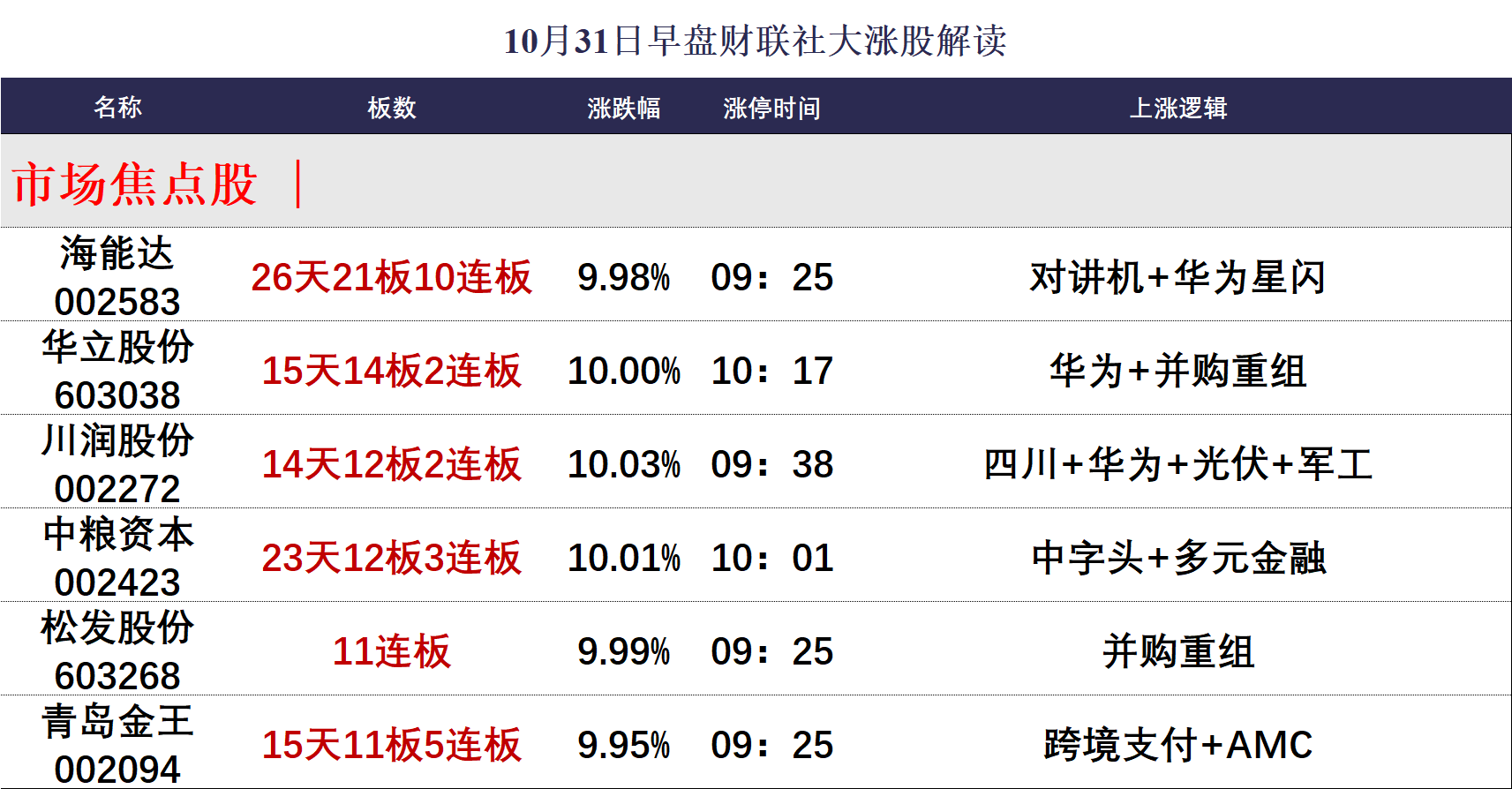 财联社10月31日电,今日午盘全市场共161股涨停,连板股总数72只,45股封板未遂,封板率为78%(不含ST股、退市股)。焦点股方面,强势股继续活跃,海能达26天21板10连板、华立股份15天14板2连板、川润股份14天12板2连板;非银金融板块盘中走强,中粮资本23天12板3连板,东方财富一度涨超13%。