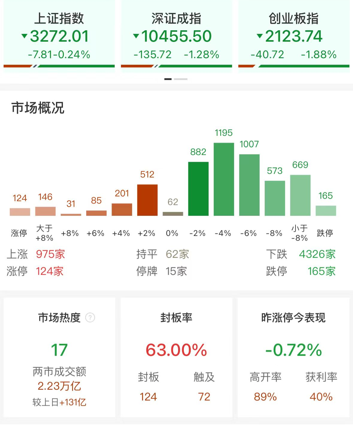 财联社11月1日电,市场全天震荡分化,沪指相对偏强,创业板指午后持续走低,北证50指数大跌9.61%,高位股大面积跌停。沪深两市全天成交额2.23万亿,较上个交易日放量131亿。全市场逾500股跌超9%,海能达、凤凰航运等多股上演“天地板”。盘面上,周期股集体走强,稀土永磁板块大涨,正海磁材、金力永磁、中国稀土、北方稀土等20余股涨停。医药商业概念股震荡走高,漱玉平民、老百姓、第一医药、健之佳等涨停。大消费股表现活跃,白酒、食品股领涨,水井坊、麦趣尔、黑芝麻等涨停。下跌方面,并购重组、软件、半导体、鸿蒙等多个近期热门的题材板块集体大跌。整体上个股跌多涨少,全市场超4300只个股下跌。板块方面,稀土永磁、小金属、医药商业、白酒等板块涨幅居前,智谱AI、软件开发、数据安全、鸿蒙概念等板块跌幅居前。截至收盘,沪指跌0.24%,深成指跌1.28%,创业板指跌1.88%。