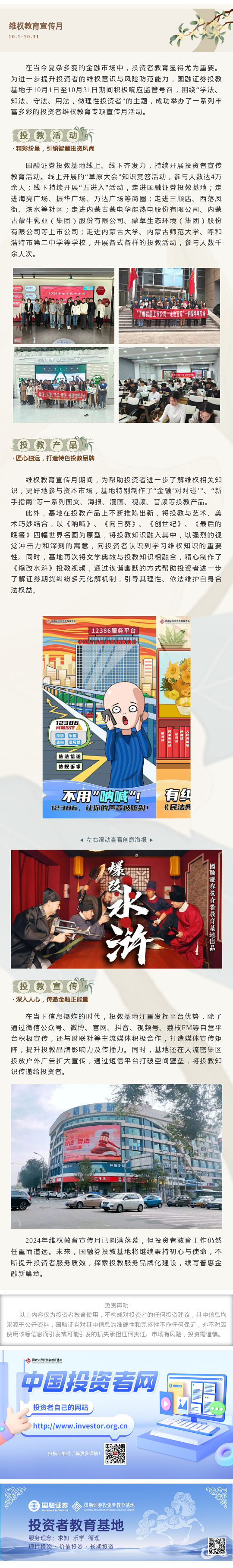 在当今复杂多变的金融市场中,投资者教育显得尤为重要。为进一步提升投资者的维权意识与风险防范能力,国融证券投教基地于10月1日至10月31日期间积极响应监管号召,围绕“学法、知法、守法、用法,做理性投资者”的主题,成功举办了一系列丰富多彩的投资者维权教育专项宣传月活动。