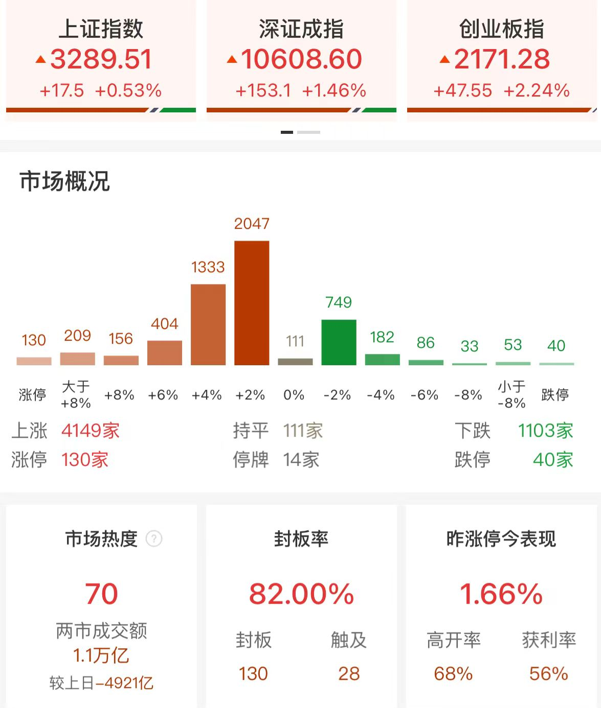 财联社11月4日电,市场早盘震荡反弹,创业板指领涨。沪深两市半日成交额1.1万亿,较上个交易日缩量4921亿。盘面上,机器人概念股集体走强,瑞迪智驱、天奇股份、埃斯顿、柯力传感、亿嘉和等多股涨停。大消费股迎来反弹,金种子酒、黑芝麻、九阳股份等涨停。券商股等金融股表现活跃,东兴证券、建元信托、新力金融等涨停。部分高位股展开修复,华映科技、松发股份、延华智能等走出“地天板”。下跌方面,稀土永磁板块高开低走,中科磁业、正海磁材跌超10%。总体上个股涨多跌少,全市场超4100只个股上涨。板块方面,人形机器人、脑机接口、汽车整车、小家电等板块涨幅居前,小金属、稀土永磁、托育服务、海南等板块跌幅居前。截至收盘,沪指涨0.53%,深成指涨1.46%,创业板指涨2.24%。