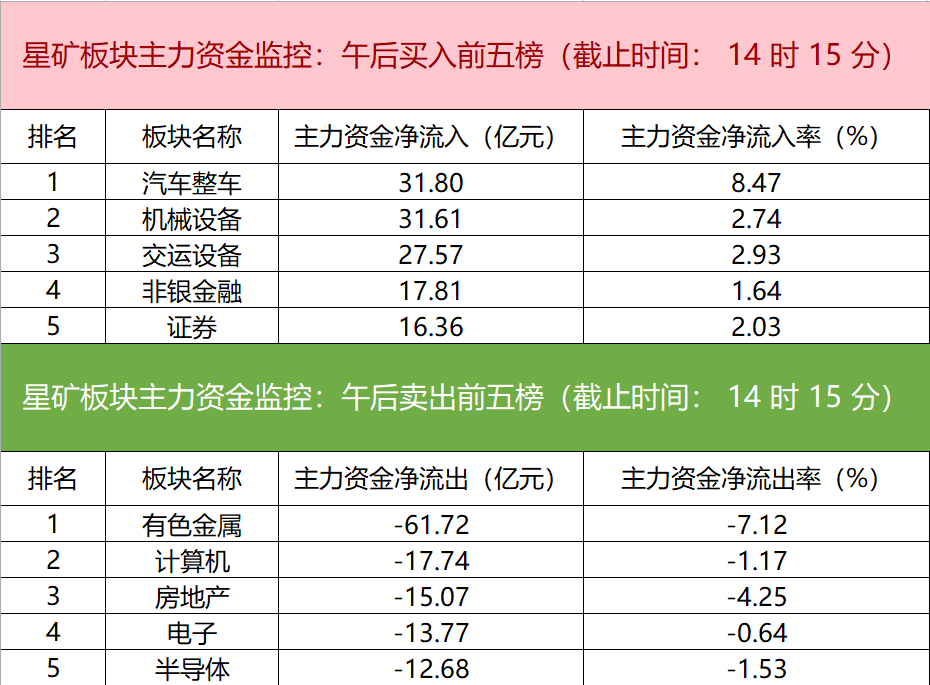 财联社11月4日电,财联社星矿数据显示,今日主力资金净流入汽车整车、机械设备、交运设备等板块,净流出有色金属、计算机、房地产等板块,其中有色金属板块净流出61.72亿元。个股方面,上海电气涨停,主力资金净流入20.07亿元居首位,常山北明、北汽蓝谷、东方财富获主力资金净流入居前;中国长城遭净卖出15.73亿元居净流出首位,通富微电、万丰奥威、北方稀土等主力资金净流出额居前。