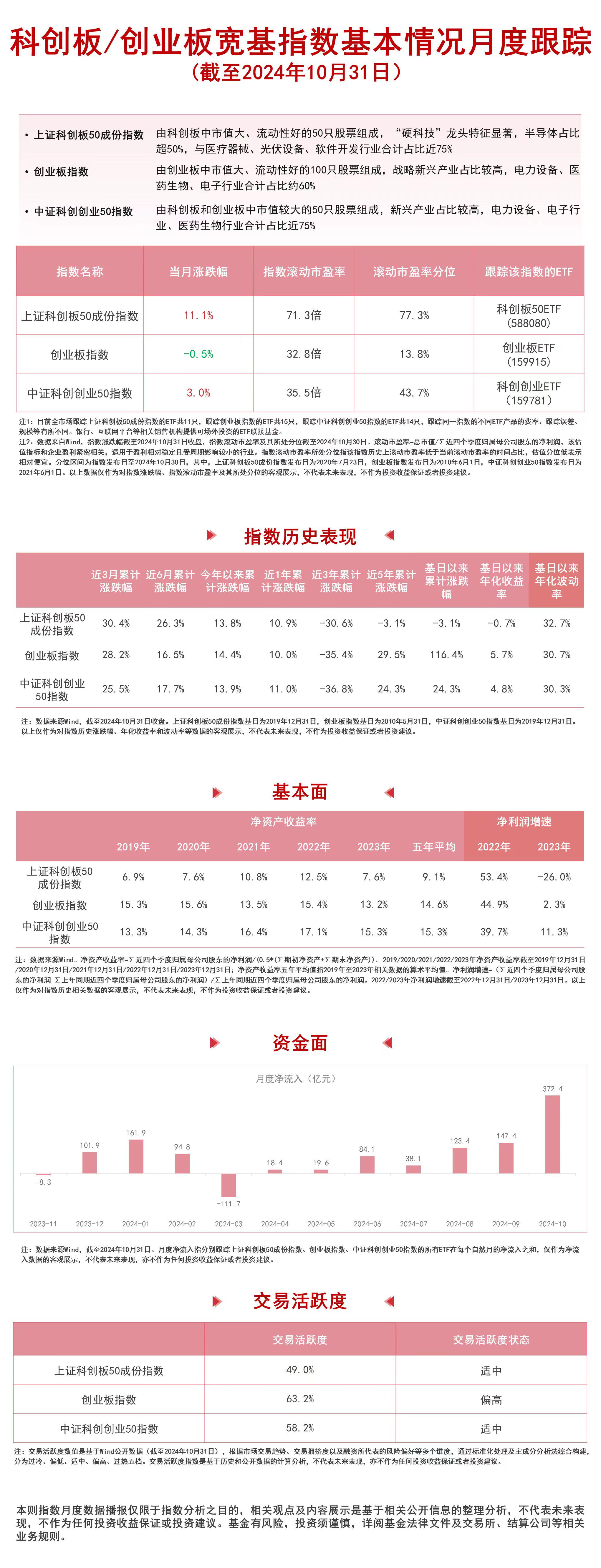 10月,上证科创板50成份指数上涨11.1%,中证科创创业50指数上涨3.0%,创业板指数下跌0.5%,超300亿资金净流入跟踪上述指数的ETF产品。
