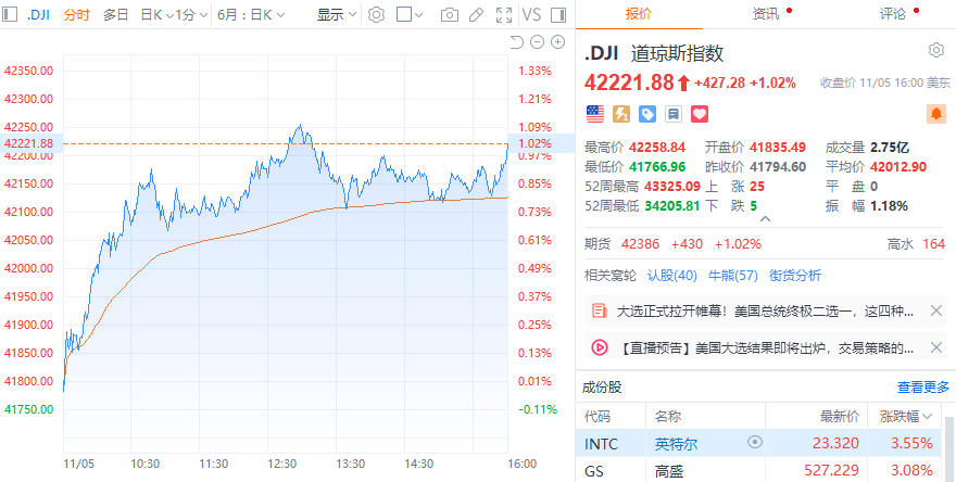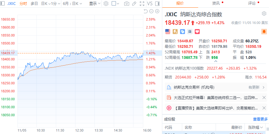 财联社11月6日电,美股三大指数集体收涨,纳指涨1.43%,标普500指数涨1.23%,道指涨1.02%。大型科技股普涨,英特尔、特斯拉涨超3%,英伟达、Meta涨逾2%,亚马逊、奈飞涨超1%,微软、谷歌、苹果小幅上涨。其中,英伟达总市值达3.43万亿美元,超越苹果公司,重新成为全球市值最高的公司。特朗普概念股尾盘跳水,特朗普媒体科技集团收盘跌超1%,盘中一度涨约18%。