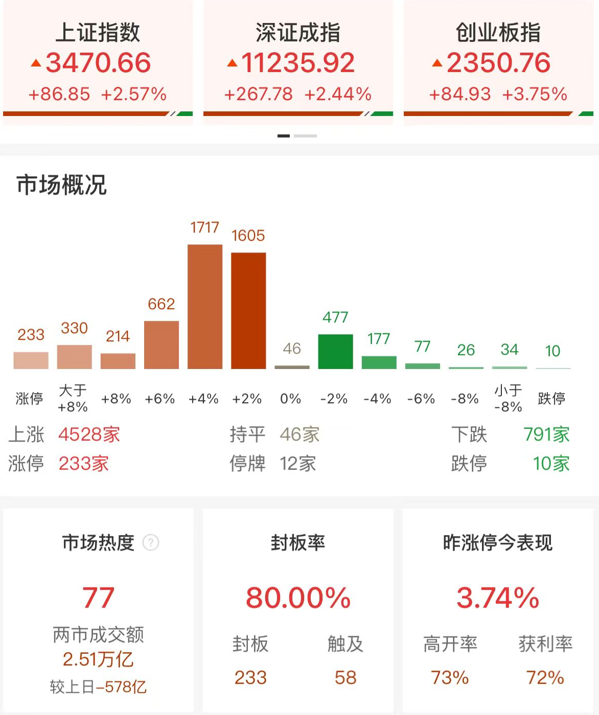 财联社11月7日电,市场全天低开高走,创业板指领涨。沪深两市全天成交额2.51万亿,较上个交易日缩量578亿。盘面上,大金融股午后再度爆发,东方财富、中信证券、同花顺均再创历史新高,中国人寿、赢时胜、中信建投、首创证券等多股涨停。大消费股集体走强,白酒、食品饮料、旅游、零售等多个方向大涨,酒鬼酒、水井坊、西王食品、西安饮食、中央商场等多股涨停。地产股表现活跃,南国置业、荣盛发展、绿地控股、信达地产等多股涨停。基建环保股震荡走强,碧水源、大千生态、兴源环境、启迪环境等多股涨停。下跌方面,军工股陷入调整,中航沈飞等跌超5%。整体上个股涨多跌少,全市场超4500只个股上涨,近200股涨停。板块方面,白酒、保险、食品、证券等板块涨幅居前,贵金属、军工、人形机器人、飞行汽车等板块跌幅居前。截至收盘,沪指涨2.57%,深成指涨2.44%,创业板指涨3.75%。