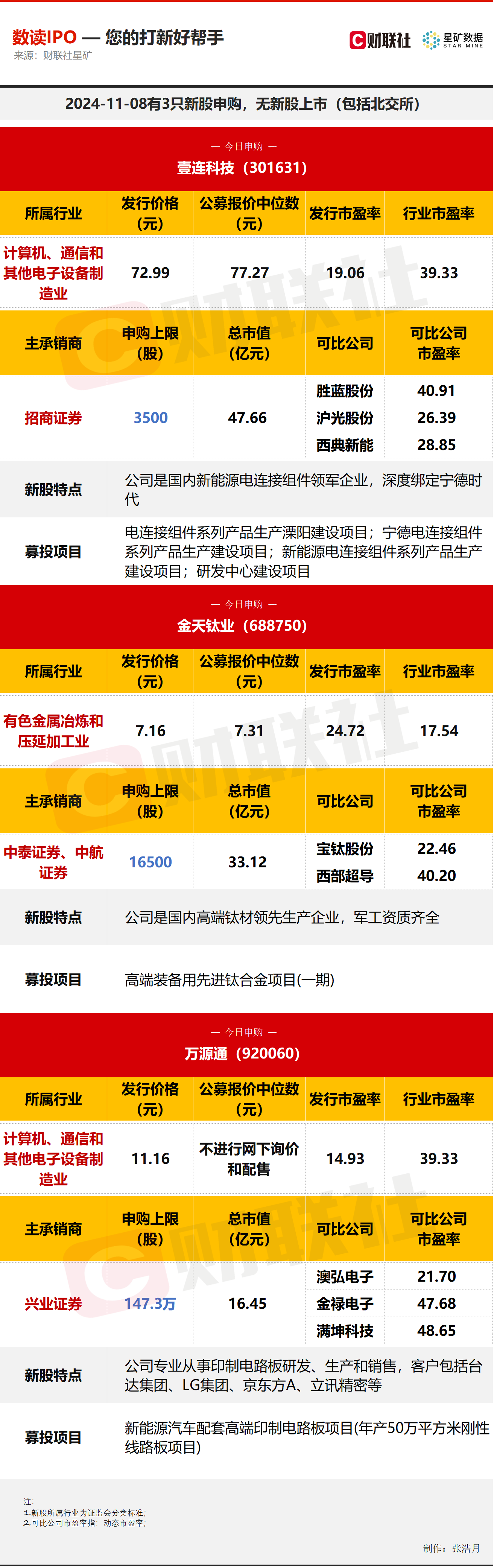 财联社11月8日电,今日有3只新股申购,分别为创业板的壹连科技,科创板的金天钛业,北交所的万源通。