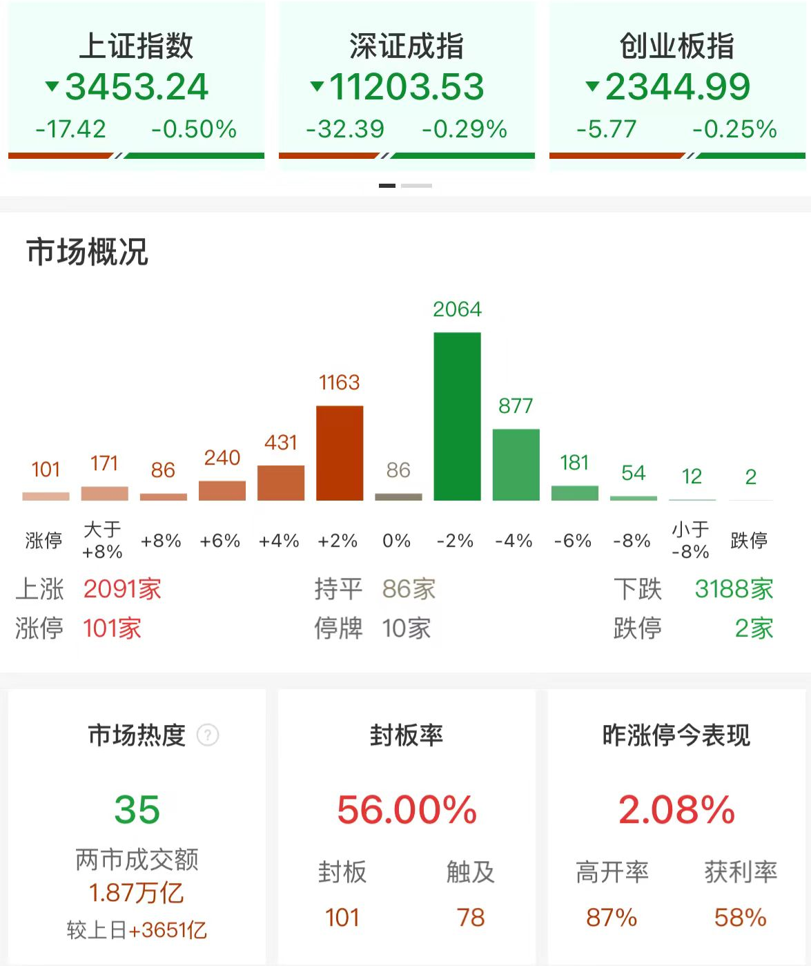 财联社11月8日电,市场早盘高开回落,三大指数均小幅下跌。沪深两市半日成交额1.87万亿,较上个交易日放量3651亿。盘面上,芯片股集体爆发,上海合晶、国芯科技、灿芯股份、华大九天等涨停,北方华创、中芯国际、海光信息等创历史新高。卫星导航概念股震荡走强,合众思壮、上海沪工、博通集成等涨停。固态电池概念股一度冲高,蓝海华腾、福能东方、有研新材、紫江企业等涨停。信创概念股表现活跃,中国软件、东方通、中安科、中电兴发等涨停。下跌方面,地产股陷入调整,滨江集团等多股跌超5%。总体上个股跌多涨少,全市场超3100只个股下跌。板块方面,半导体、光刻机、卫星导航、CPO等板块涨幅居前,房地产、农业、白酒、免税等板块跌幅居前。截至收盘,沪指跌0.5%,深成指跌0.29%,创业板指跌0.25%。